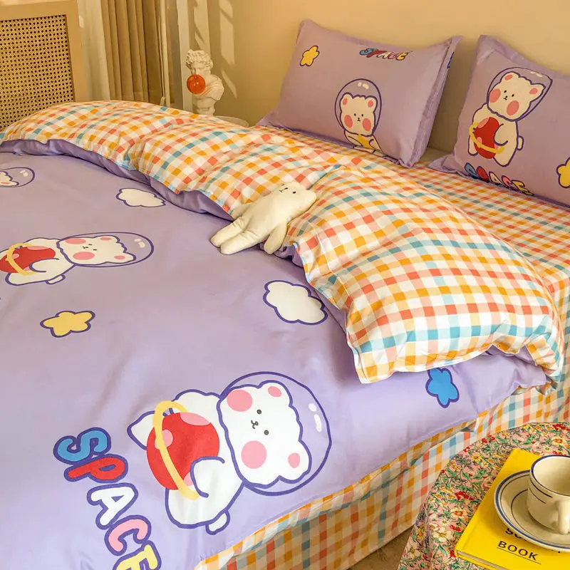 - Crianças jogo de cama bonito urso cão folha linho xadrez capa edredão fronha única rainha tamanho roupas têxteis para casa