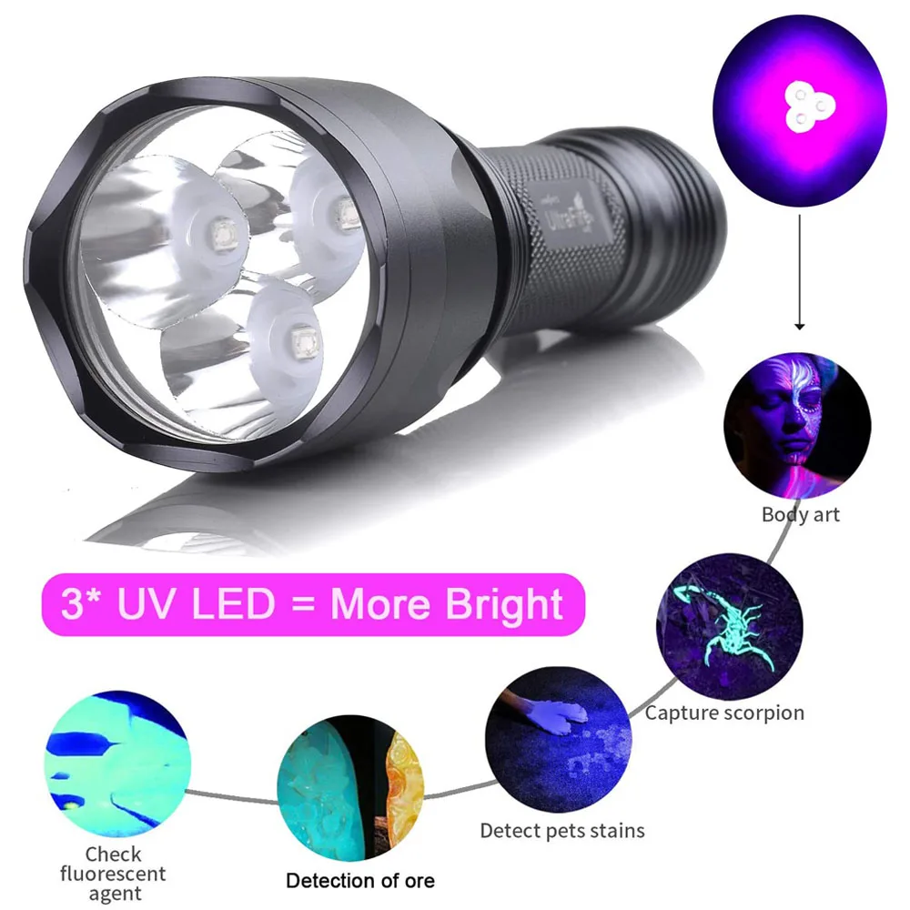 - Lanterna ultrafire de led uv, luz negra de 395nm led, detector de urina de cão/gato, manchas secas, cama, espião, detecção de escorpião, mineral