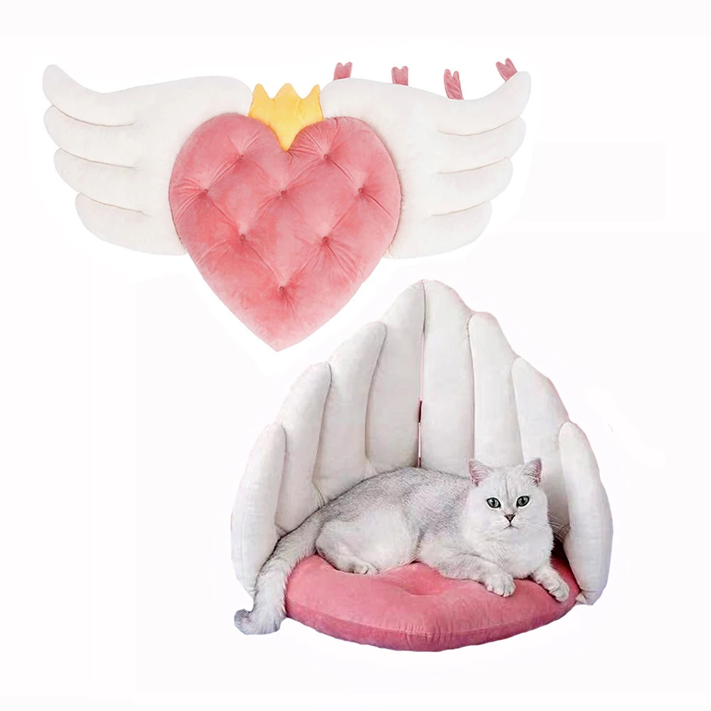 - Anjo asa luxo gato cama ninho pequeno cão animal de estimação em forma de coração cama móvel confortável lavável interior gatos filhotes cama ninho tapete