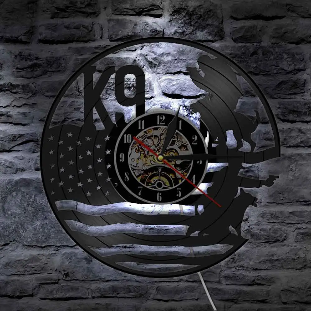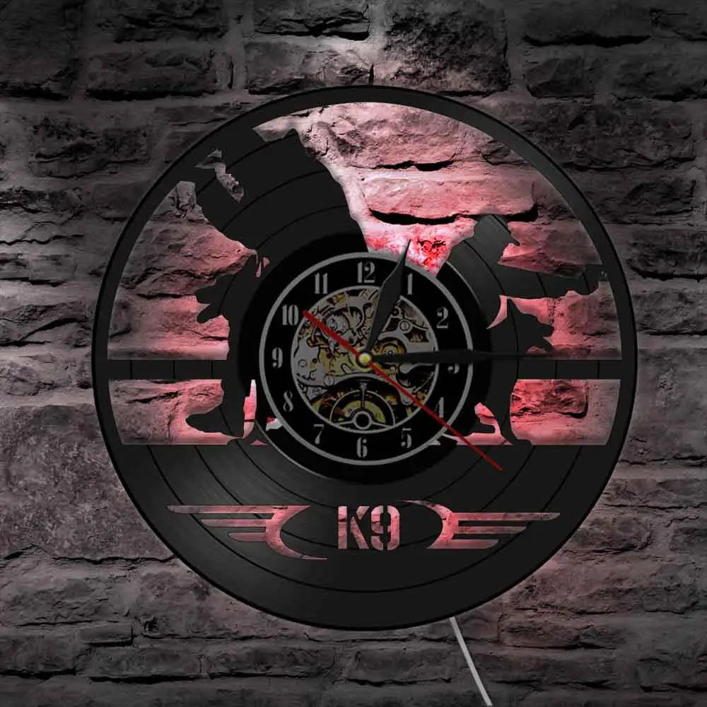 2. K9 polícia e militares cães decorativos parede arte relógio com backlight vintage vinil registro relógio de parede decoração da arte da parede presente para o menino